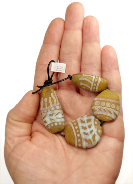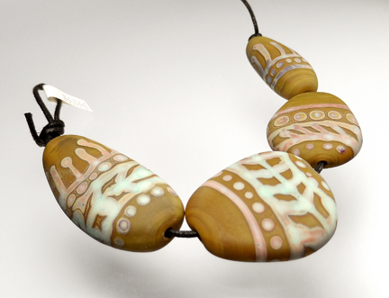 Four different sized “stone” beads made with beautiful variegated silver rich brownish yellow ochre glass with rust tones as the base of these beads, and patterned with copper green intricate stringer work to resemble ethnic batik fabric. The patterns are continuous on both sides of the beads, and are predominately a mottled light minty-green color, but have been flame reduced to produce subtle variations of coral pinks and lavender tones for a very rustic feel. Each bead is a different length and size, and have a total strand length of 4 5/8”. Stones are approximately 6-8mm thick, and the widest bead is approx. 1”. Beads have been etched matte for a velvety texture. Beads were made on a 1/16” mandrel, and as always, my beads are properly annealed and cleaned.