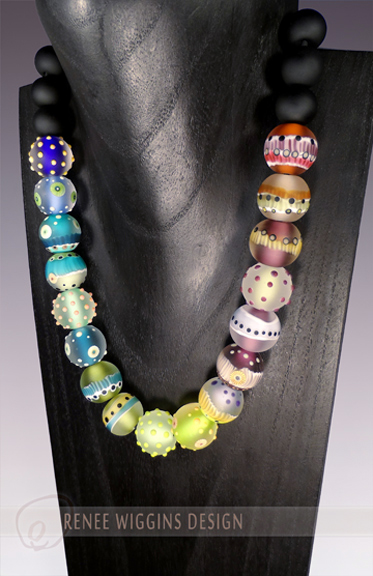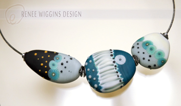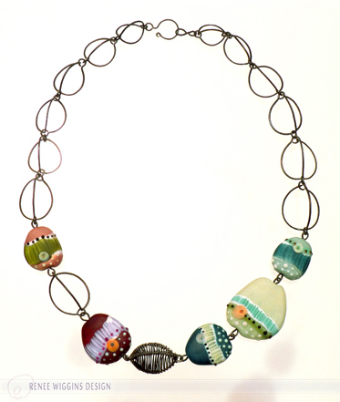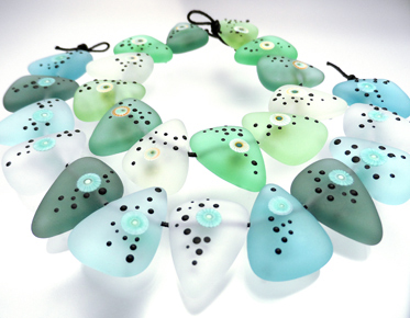 "Painted Stones and Cages" lampworked glass "stones", murrini, pleated, raised dots, etched matte. "Cages" are made of black anodized steel, formed and woven.