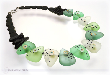 Green Jet Age necklace with handmade lampworked glass beads adorned with custom handmade murrini and raised dots. Accompanied with black cultured sea glass beads and handmade hammered and oxidized sterling silver clasp.