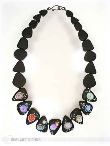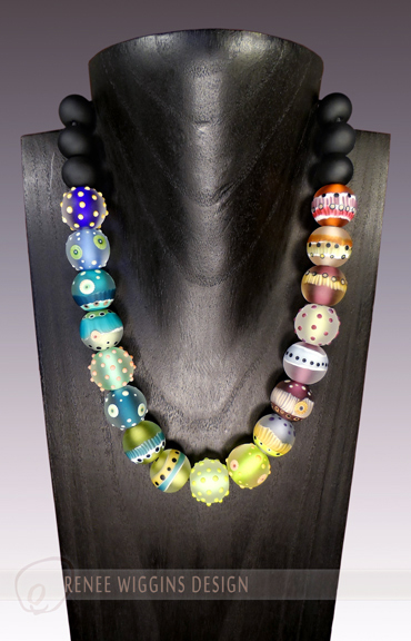 "Midnight Carnival" series necklace with handmade lampworked glass beads adorned with pools of luscious color and raised dots, and etched matte. Accompanied with black cultured sea glass beads and handmade hammered and oxidized sterling silver clasp.
