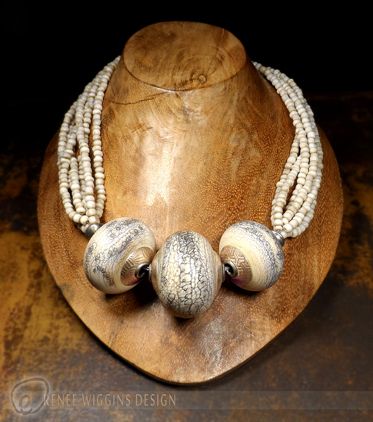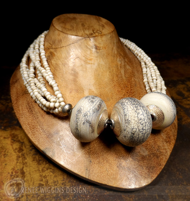Large silvered ivory blown hollow beads with custom silver caps and African tribal beads.