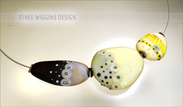 Modern three "Painted Stone" necklace in tones of yellow and cream on a steel cable necklace with black gold brushed bent disk spacer accents. Lampworked glass beads are pleated, have raised dots and multiple handmade murrini to adorn each bead. Stone beads are etched matte.